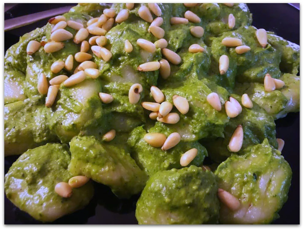 This recipe is for creamy, flavoursome, and versatile vegan pesto sauce that is a little work to make but goes well on pasta, or with gnocchi.