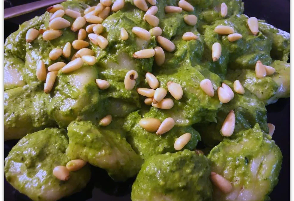 This recipe is for creamy, flavoursome, and versatile vegan pesto sauce that is a little work to make but goes well on pasta, or with gnocchi.